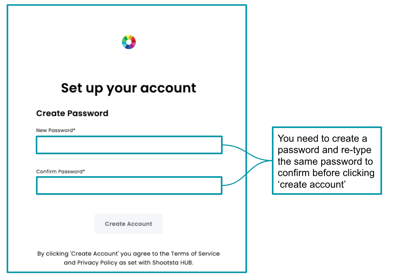 When you click 'Get Started' this will navigate you directly from your email to your Shootsta workspace. The first thing you will need to do is create a password and confirm this newly created password to create the account.